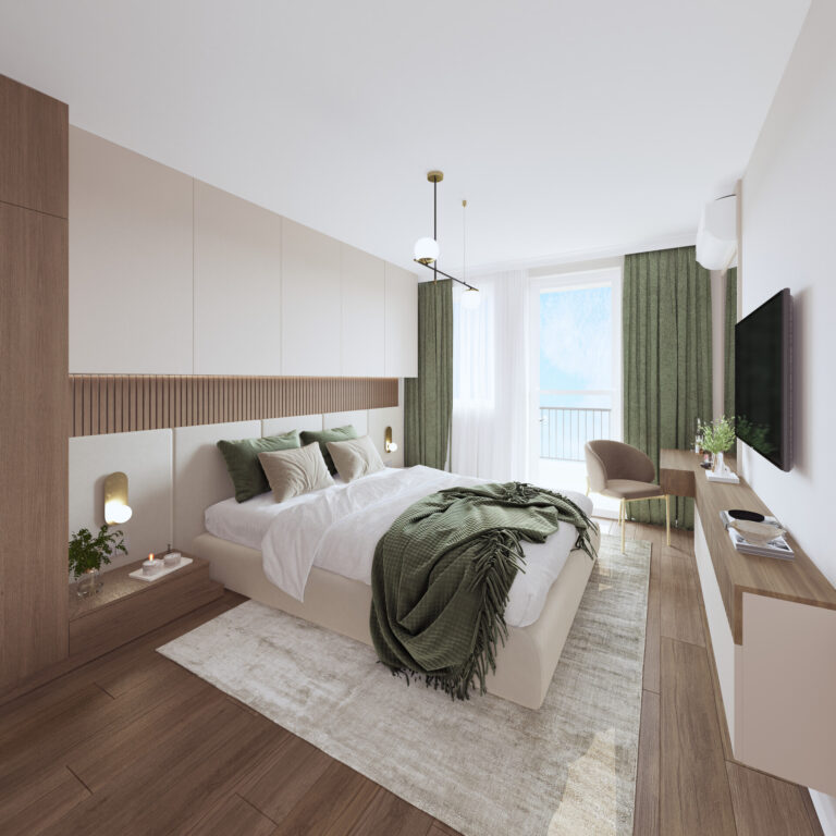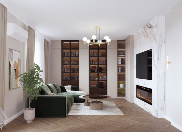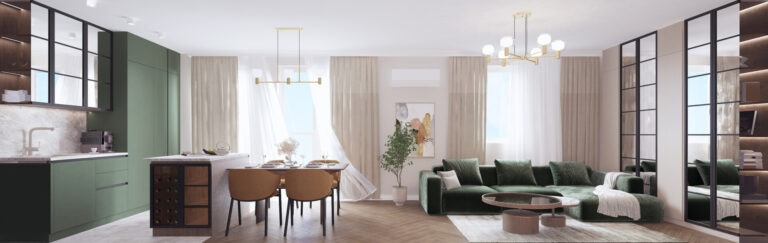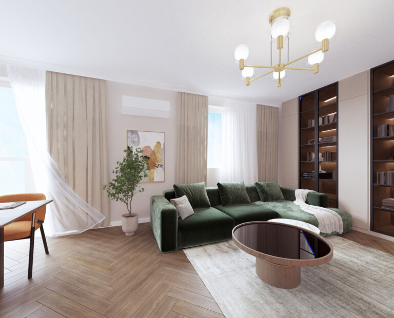 Цялостната концепция в интериора е вдъхновена от природата – от нейните цветове, текстури и усещане. Когато градската среда ни отдалечава от естественото, можем да го поканим в дома си чрез дизайнa. Масленото и евкалиптово зелено присъстват като водещи акценти в дневната зона и създават усещане за баланс и хармония, които ни дейнстват подсъзнателно и променят начина, по който преживяваме ежедневието си.