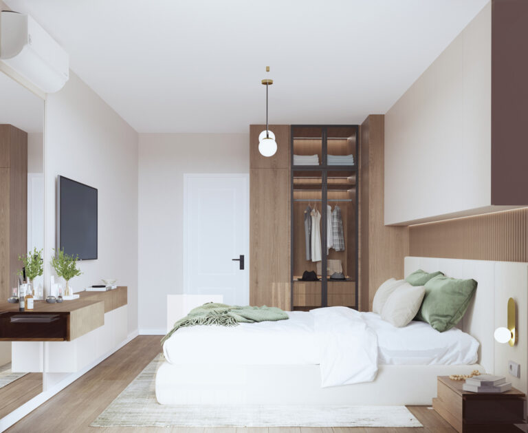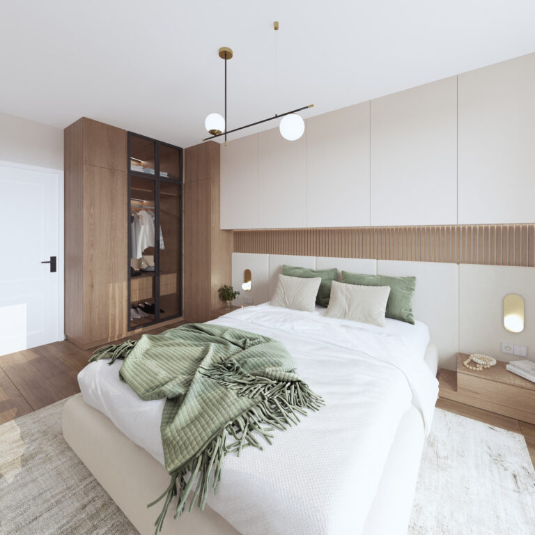 Спалнята е продължение на стилистиката в жилището. Тук отново присъстват стъклени витрини с декоративно LED осветление, тапицирана табла в меки тонове и максимално оползотворено място за съхранение – включително шкафове над леглото и гардероб с вградени решения. Целта беше да се постигне усещане за уединение, мекота и комфорт, без компромис с практичността.