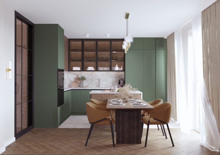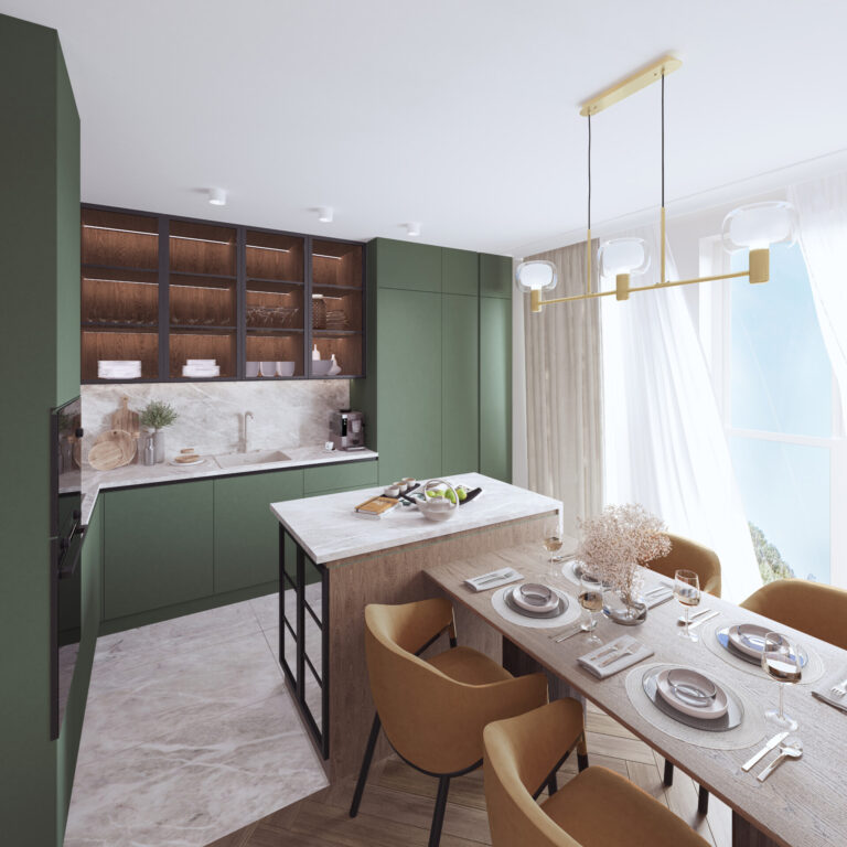 Главният герой -зеленото, изпъква още по-добре съчетано с преобладаващата цветова гама от топли, земни тонове, светли текстилни повърхности и дървесни елементи. Черните метални акценти в осветителните тела, витрините и мебелния обков подчертават линиите и добавят категоричност. Пространството е функционално разделено от кухненски остров, който дефинира две основни зони – за готвене и хранене, и зона за отдих, четене и събиране.