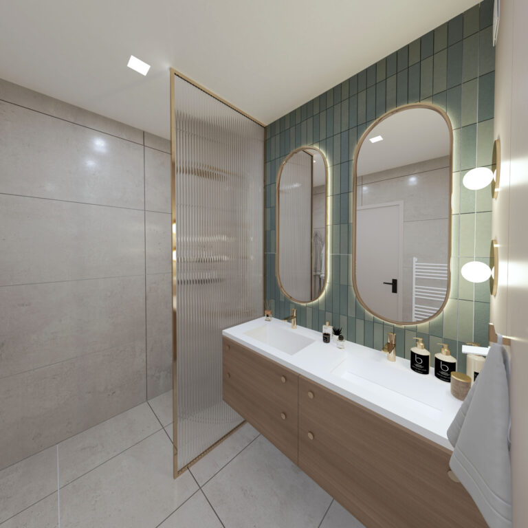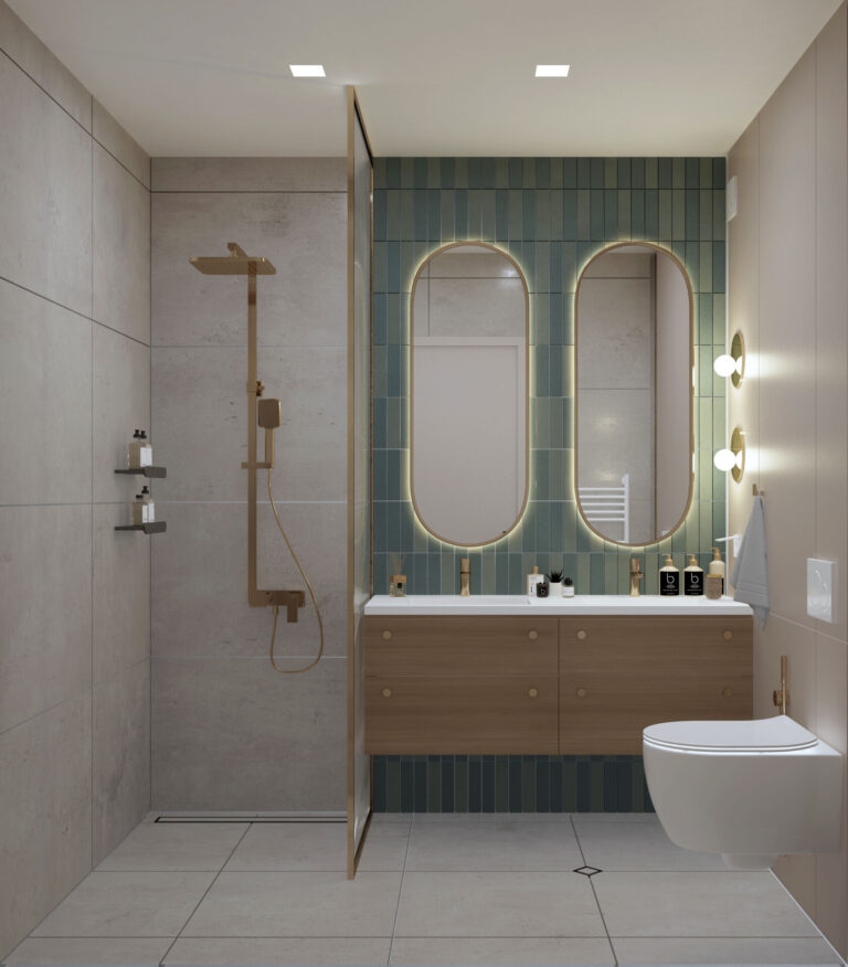 Мокрите помещения са изцяло в синхрон със стилистиката на останалата част от жилището. Вертикалният зелен фаянс зад огледалата, златистите смесители и текстурираните прегради придават усещане за изтънченост и индивидуалност.