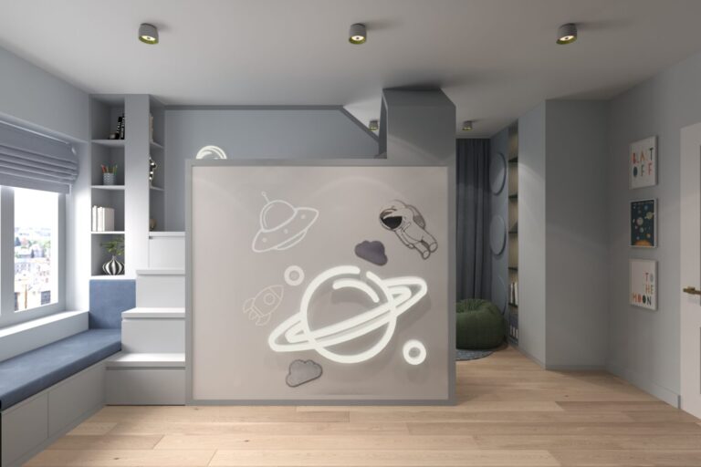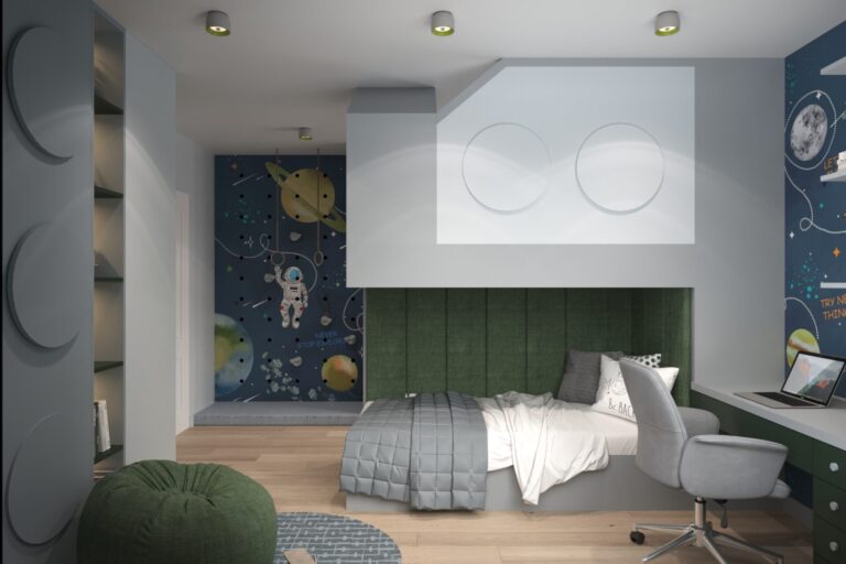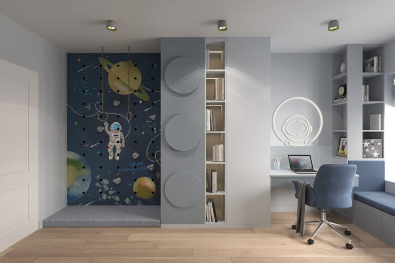 Друго желание на децата е да присъства елементът “Лего” и заедно с осветителните тела и тапети на тема Космос се пренасяме в една друга реалност на детски мечти и фантазии. Допълнителен елемент е заложената стена за катерене, която освен радост и забавление, дава възможност за допълнително движение и изразходване на енергия.