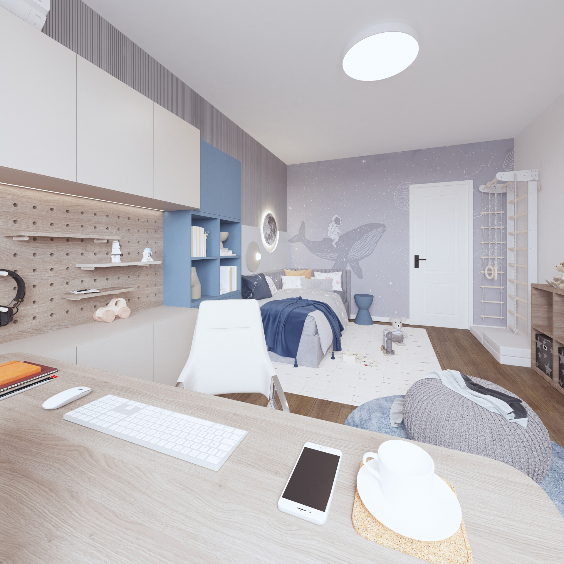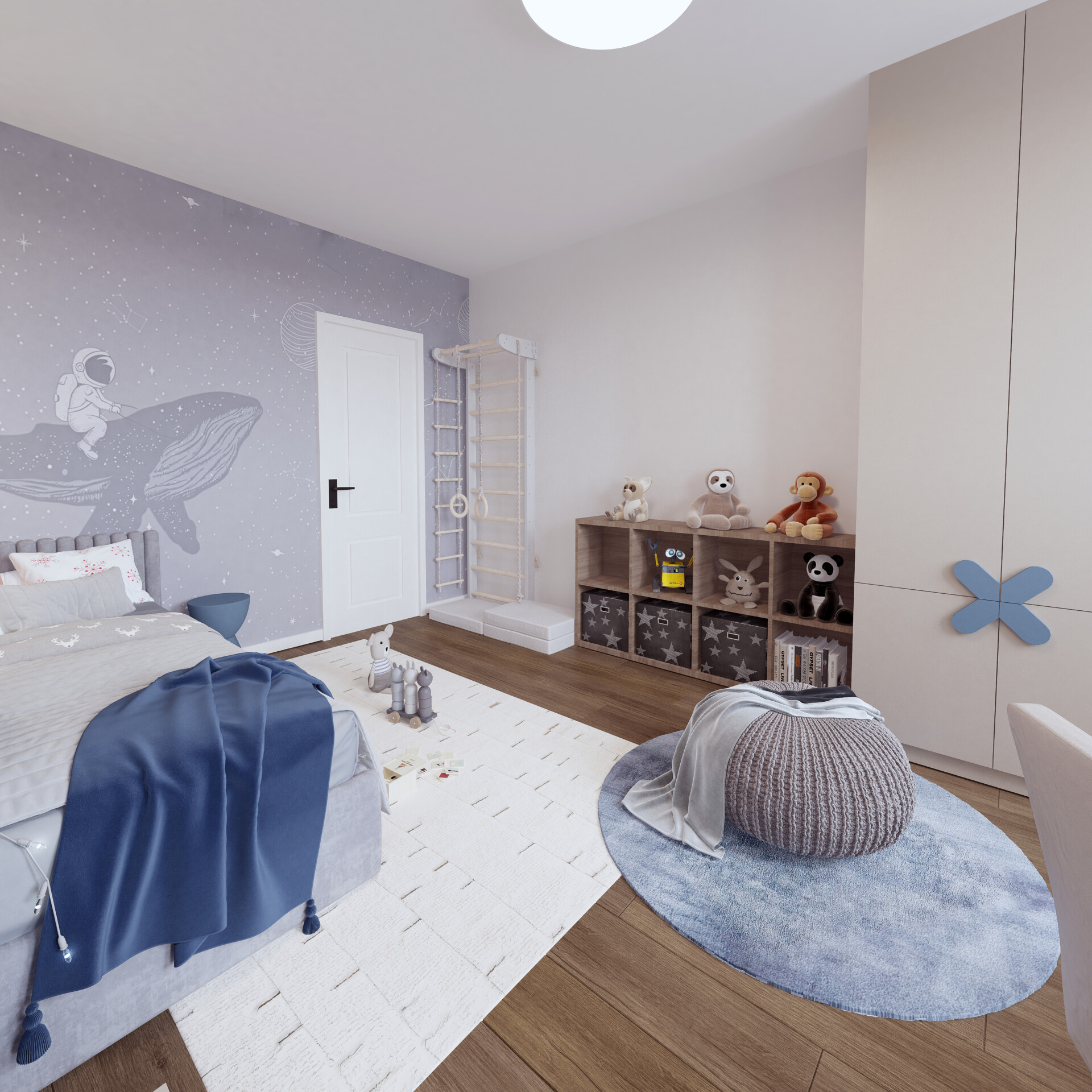 В този проект стаята е предназначена за момче, а цветовата гама е решена в бяло и синьо – неутрална, ненатоварваща и спокойна, с фини дървени елементи, които внасят уют и топлина. Пространството е обмислено така, че да расте заедно с детето – в момента е за един малък обитател, но с възможност за адаптиране и добавяне на второ легло в бъдеще.